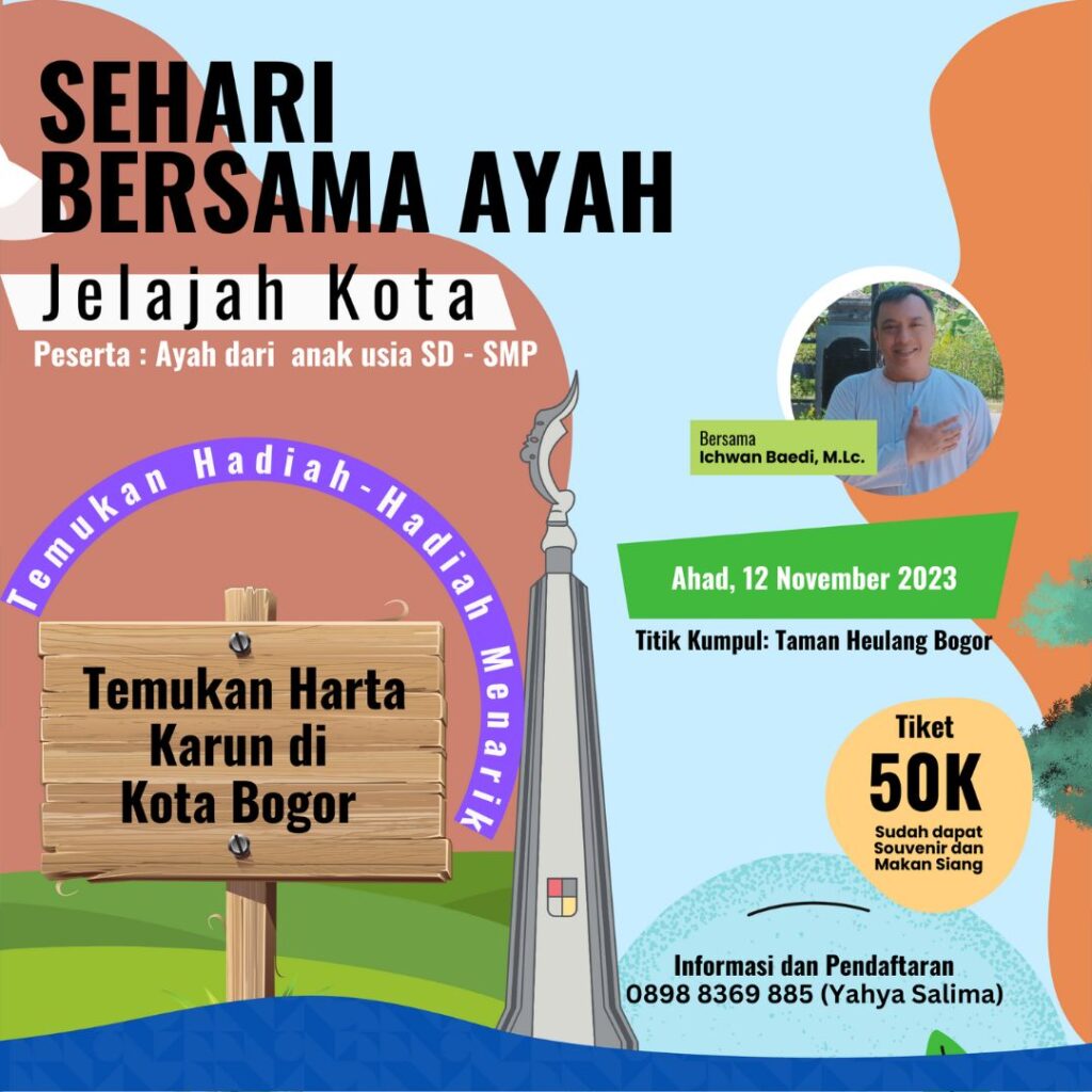 Sehari Bersama Ayah "Jelajah Kota". 12 November dikenal juga sebagai Hari Ayah. Kami mengajak para ayah untuk berpetualang mencari harta karun Kota Bogor bersama ananda. Bersama Ayah di hari Ahad, pengalaman baru, beri memori baru.