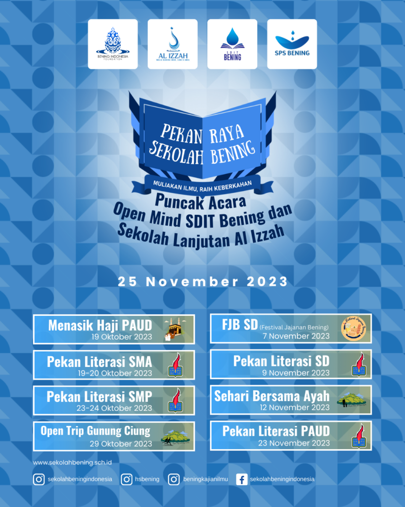 Assalamu'alaikum warahmatullahi wa barakatuh Bapak Ibu memilihkan sekolah anak sejatinya kita sedang memilihkan patner mendidik untuk anak-anak kita. Kita sepakat bahwa pendidikan yang paling utama adalah pendidikan Keimanan diikuti dengan penguatan akhlak dan amal. Bagaimana menyiapkan para pemuda aqil baligh untuk mampu menjadi seorang mukallaf , yang mampu menjalankan karirnya kelak sehingga dapat menjalankan tugas dan misi kekhalifahannya . Kami Sekolah Bening Indonesia mengajak Bapak Ibu untuk menyaksikan pemaparan Seminar juga presentasi Rania dkk sebagai siswa Sekolah Bening Indonesia untuk hadir pada : OPEN MIND dengan tema Mempersiapkan Karir untuk Pemuda Aqil Baligh. Hari : Sabtu, 4 Mei 2024 Jam : 09.00 - 11.00 Tempat : Red Corner Lt. 2, Makassar